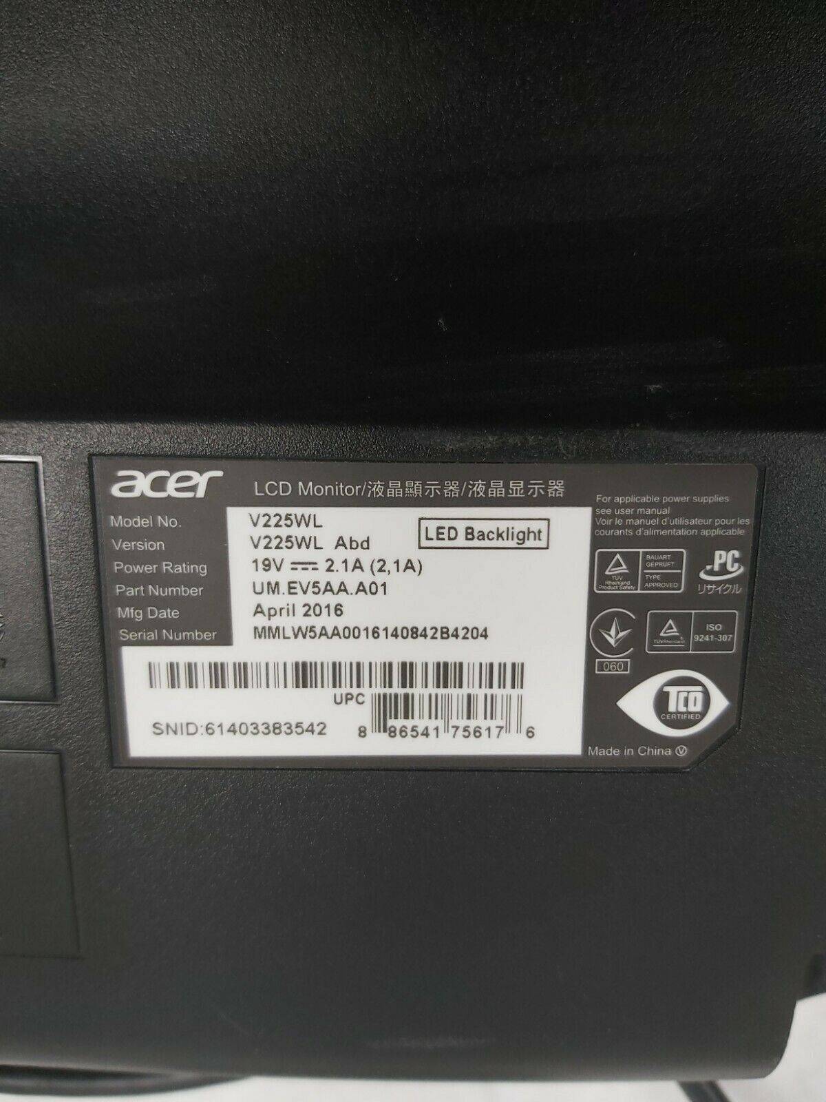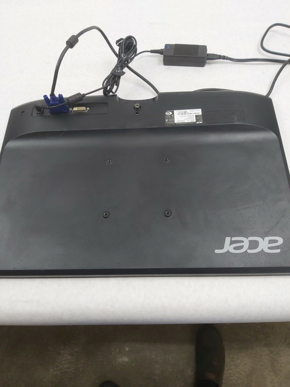 Grade B. No stand, no power supply, and no VGA. Bezel has some scratches. There are a few noticeable scratches on the lower left of the screen.