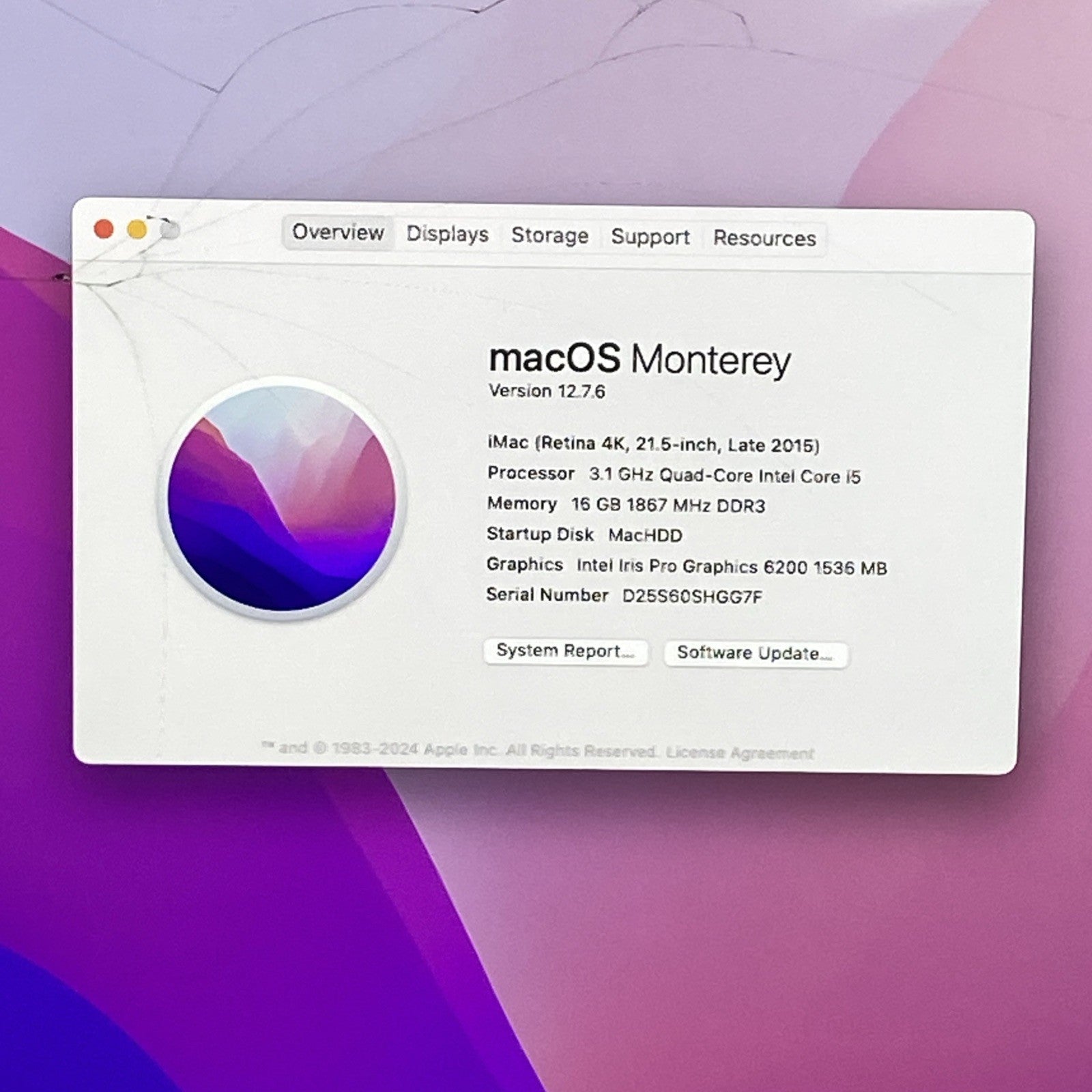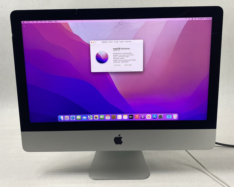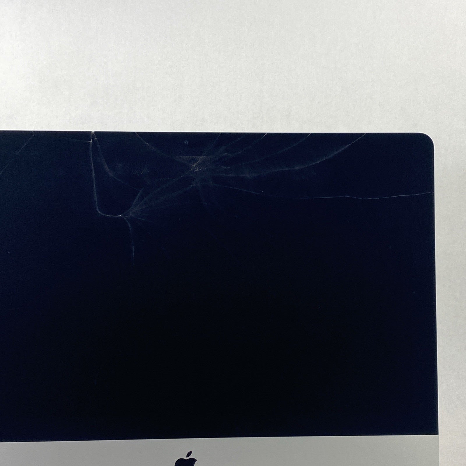 Cracked screen. Fusion drive (1TB HDD + 24GB SSD) wiped. Fresh install of operating system. No issues detected with display or screen glass. Nonetheless Buyer may find minor defects. Thunderbolt SD and Headphone jack UNTESTED. USB ports, Speakers, Microphone, Webcam tested and do work. Grade B exterior: some blemishes such as scratches, scuffs, discoloration, or other negligible signs of use/age. Includes generic AC power cord. No keyboard, no mouse, no other accessories. Due to the severely cracked screen this iMac is listed as for parts or repair, sold as is, with no returns.