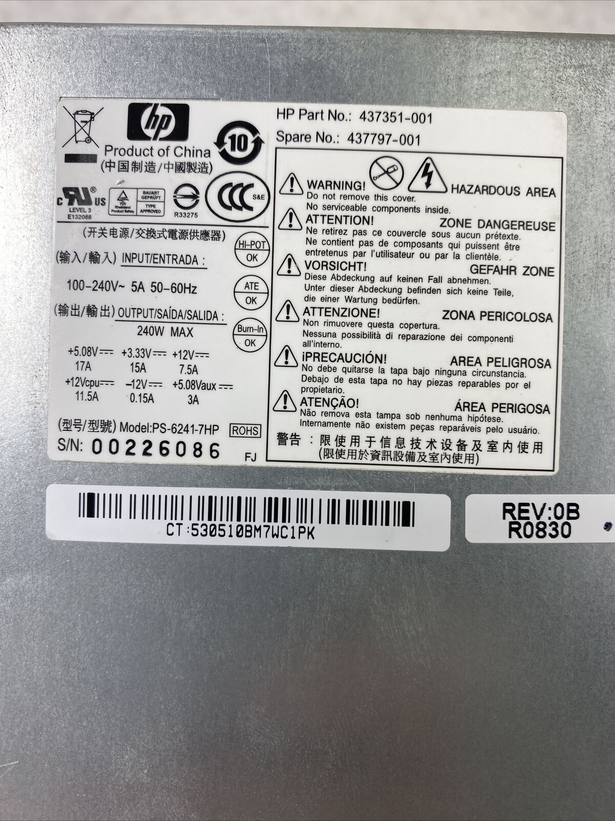 HP 437351-001 240 Watt Power Supply PS-6241-7HP 437797-001 For DC7800