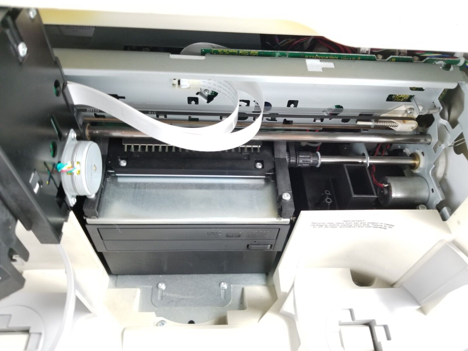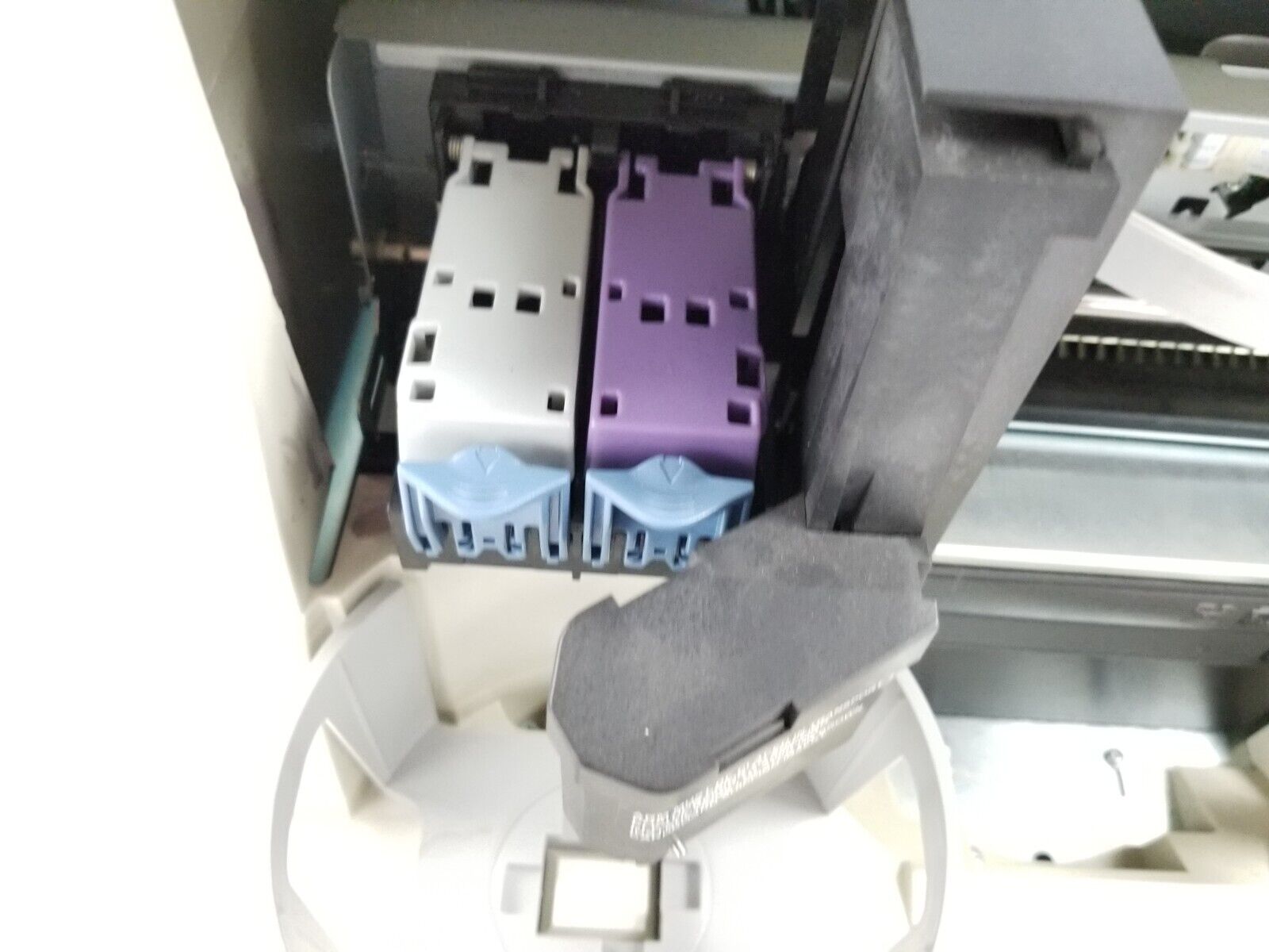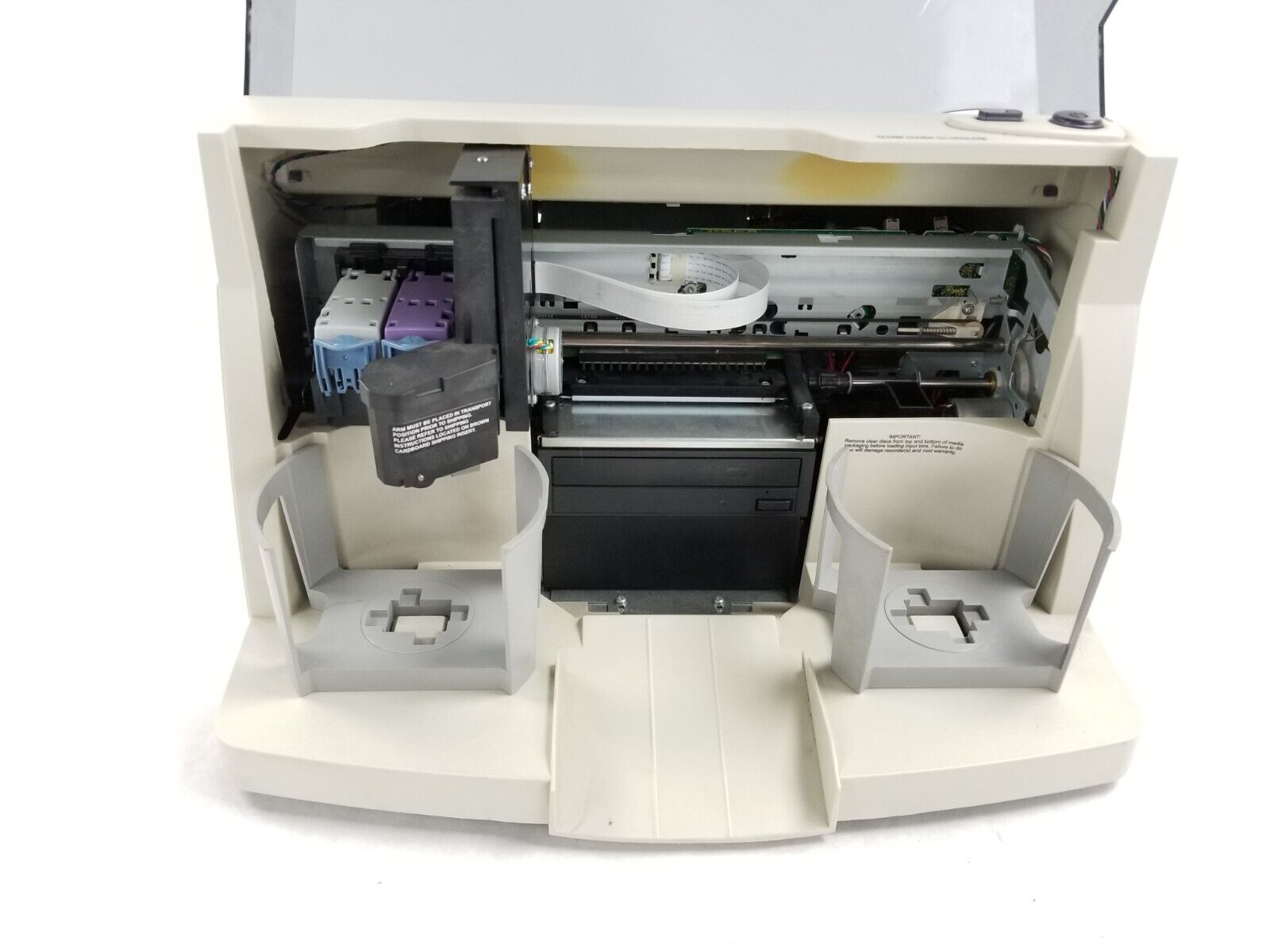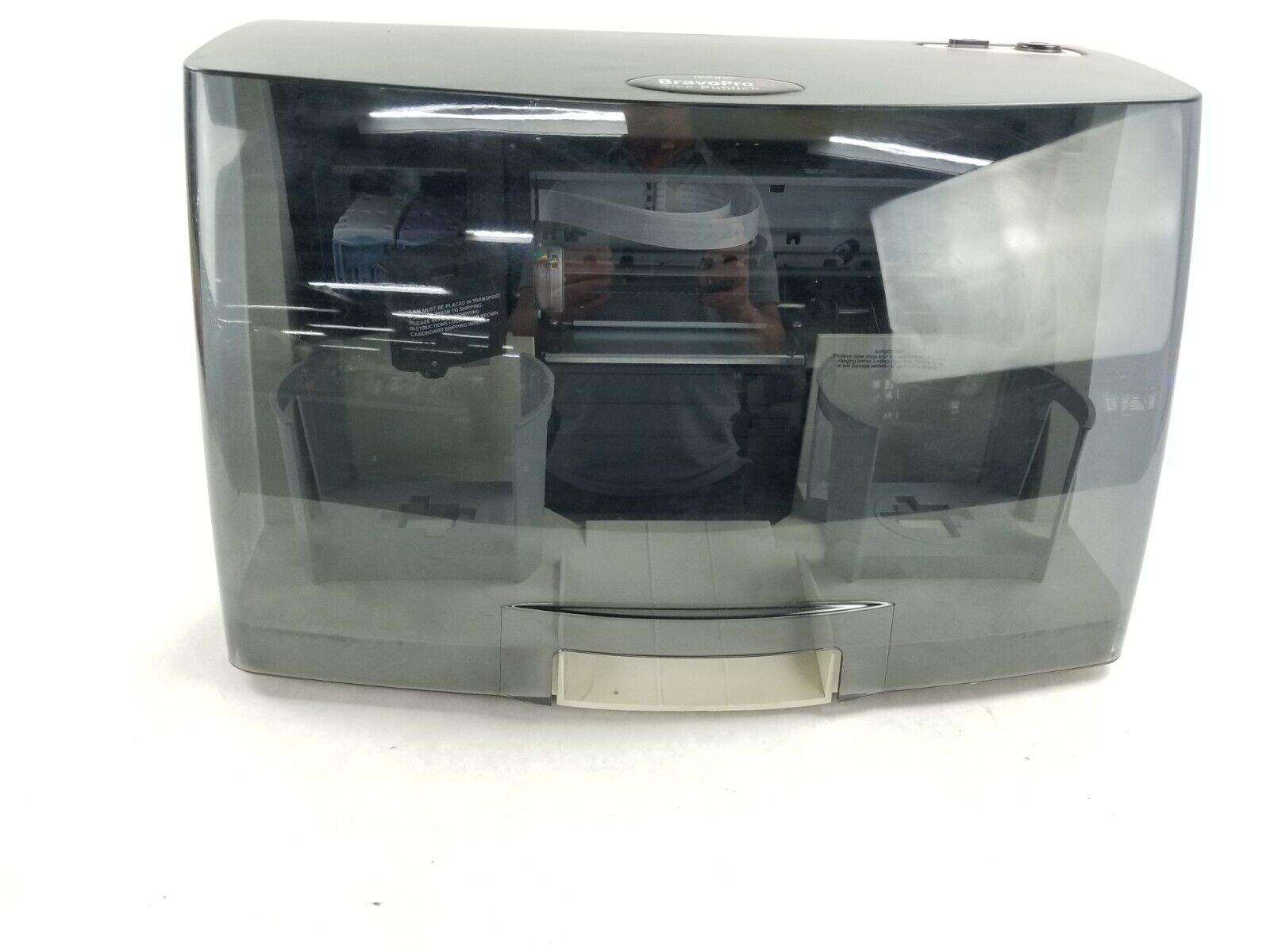 Tested and works. Needs new ink. The latches on the ink holders are broken. When putting the ink cartridge in you have to hold a plastic piece up in order to close it.