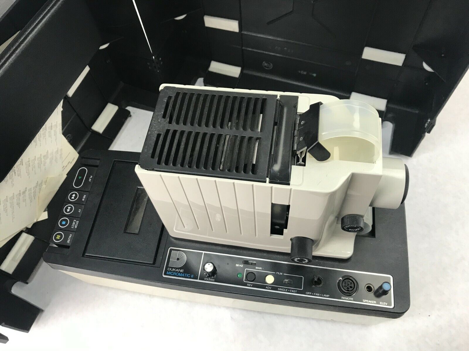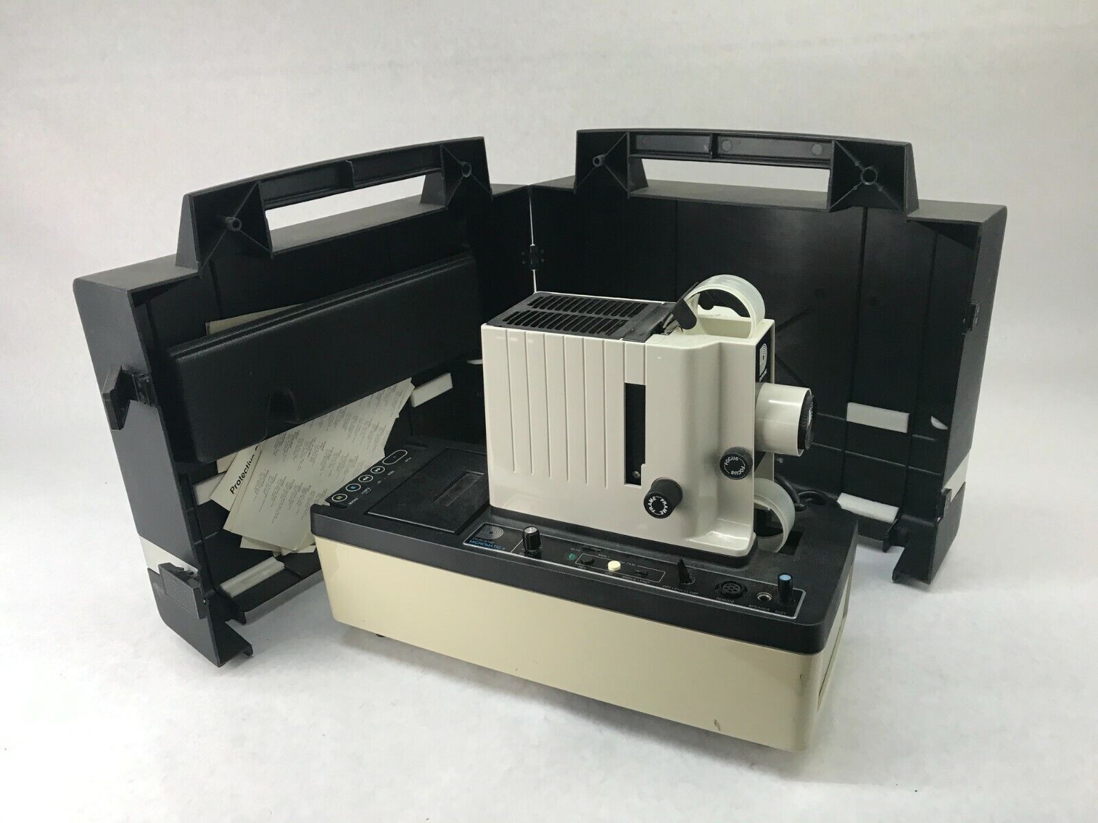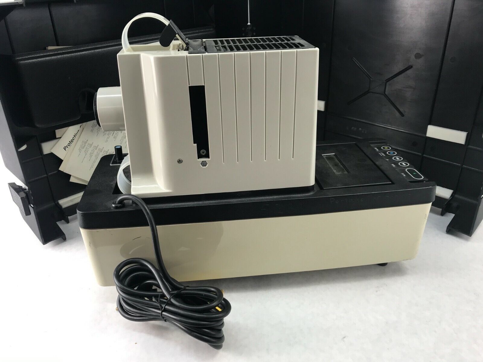 Unit powers on and seem to be working. The tape functions work, but we did not have a tape to test with. The light and fans also are working. See pictures for condition details.