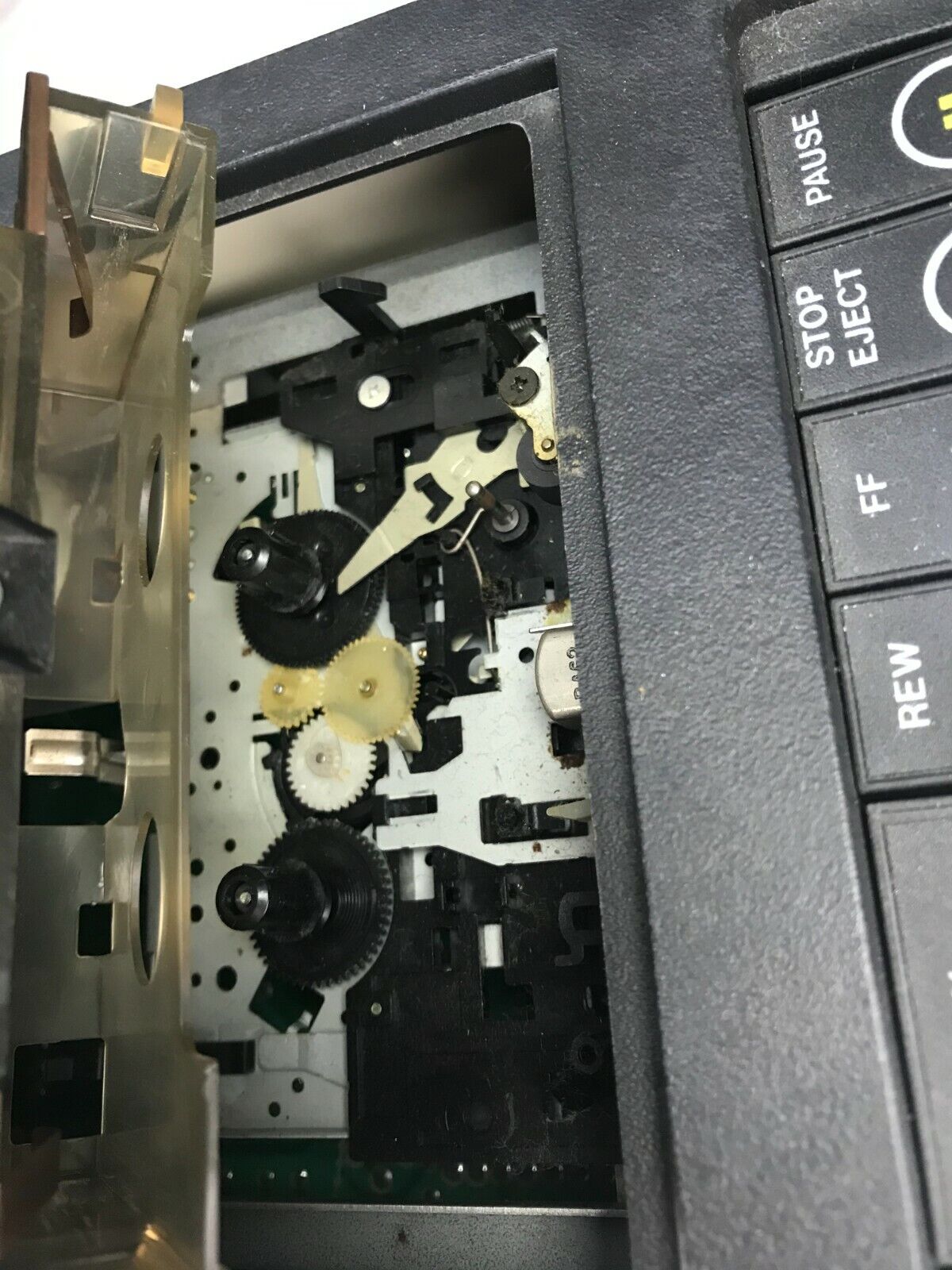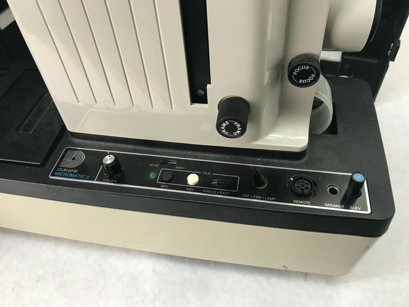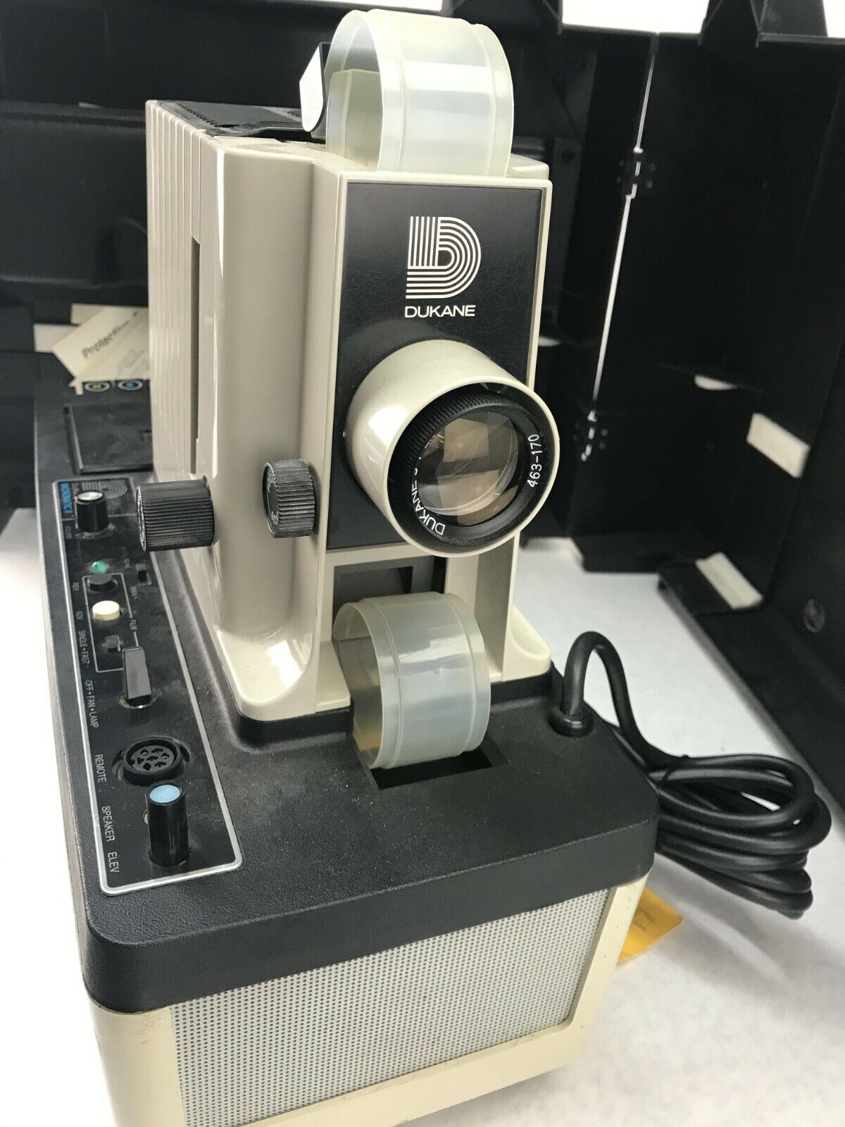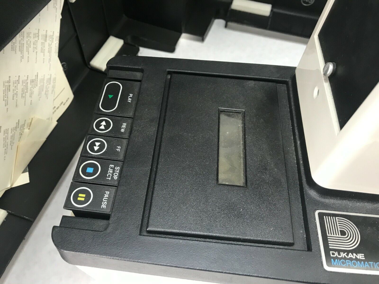 Unit powers on and seem to be working. The tape functions work, but we did not have a tape to test with. The light and fans also are working. See pictures for condition details.